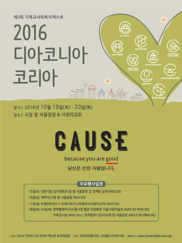 [뉴스앤조이-박요셉 기자] 한국교회희망봉사단(대표회장 김삼환 목사)이 15일부터 서울광장과 사랑의교회서 '기독교 사회복지 엑스포 2016 디아코니아 코리아'를 개최한다. 한국 개신교가 130여 년 동안 펼친 봉사 활동을 되돌아보는 시간이다.