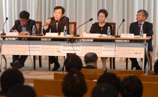 이승훈 숙명여대 기초교양학부 교수(왼쪽 두번째)가 18일 한국기독교사회복지엑스포 자원봉사 콘퍼런스에서 한국교회의 봉사활동 방향에 대해 설명하고 있다. 강민석 선임기자